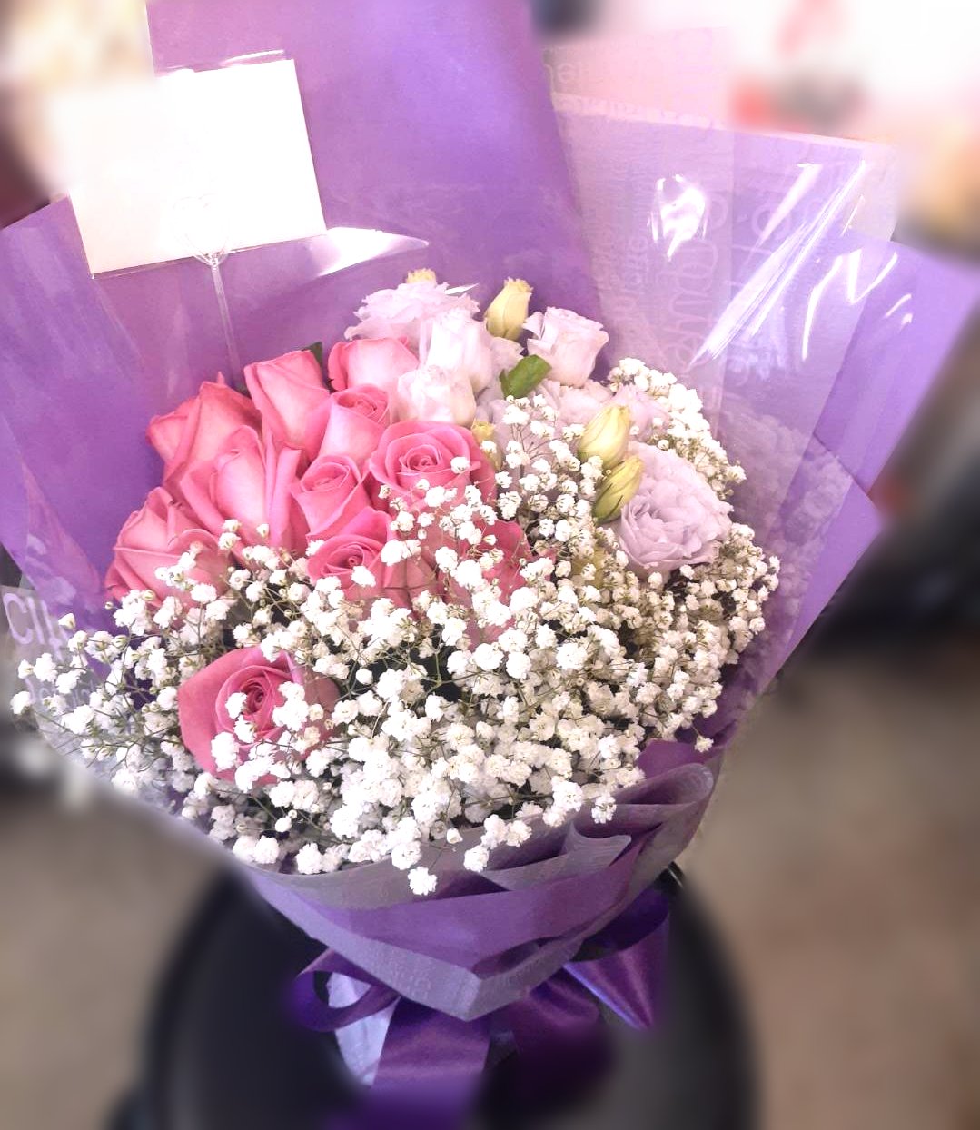 內容如圖 :玫瑰11朵+桔梗+滿天星葉材等花束