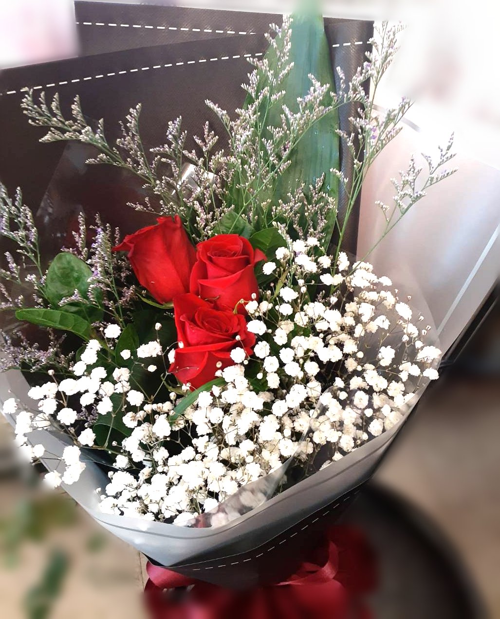 包裝規格 : 約20*15公分 花材說明 : 3朵玫瑰+滿天星葉材等