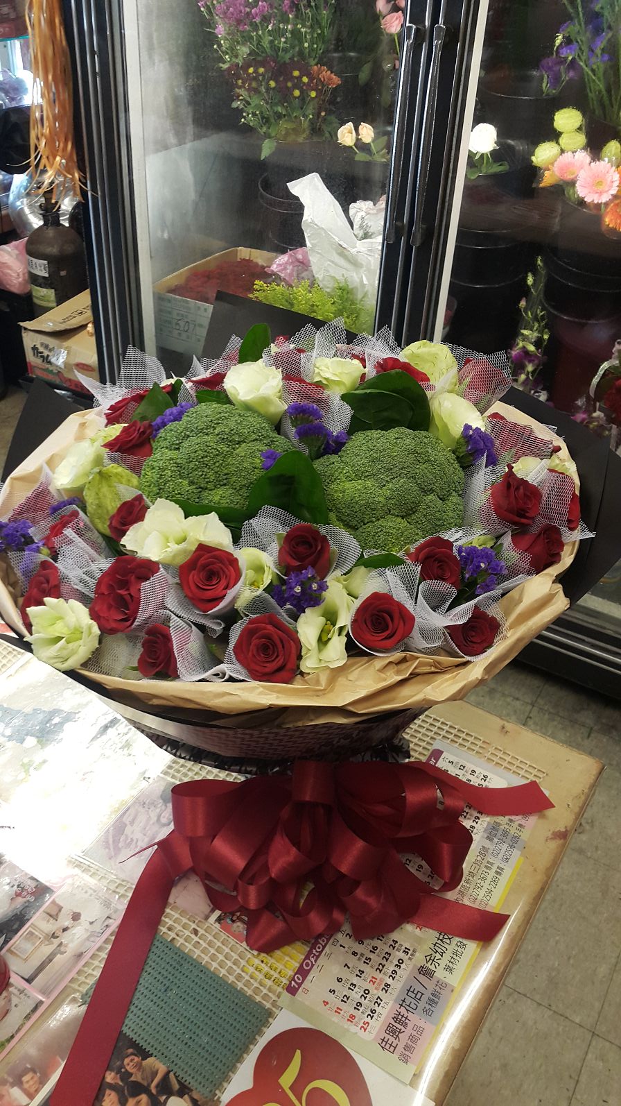 花禮材料~當季新鮮花椰菜+21朵紅玫瑰+葉材等~